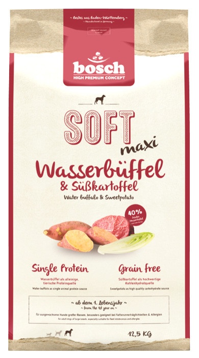 Корм с буйволом и бататом произведён на основе свежего мяса без использования мясной муки и относится к категории кормов holistic+. Свежее мясо и особая полувлажая консистенция обеспечивают великолепную вкусовую привлекательность. Использование единственного источника животного белка и отсутствие злаков в составе снижают риск пищевой непереносимости и аллергии. Буйвол обладает низким аллергенным потенциалом и отлично подходит собакам с чувствительным пищеварением. Высокое содержание биологические активных антиоксидантов поддерживает иммунитет и замедляет процессы старения. Благодаря полувлажной консистенции гранулы корма оказывают особенно бережное воздействие на зубы и дёсны, что особенно важно для пожилых собак.