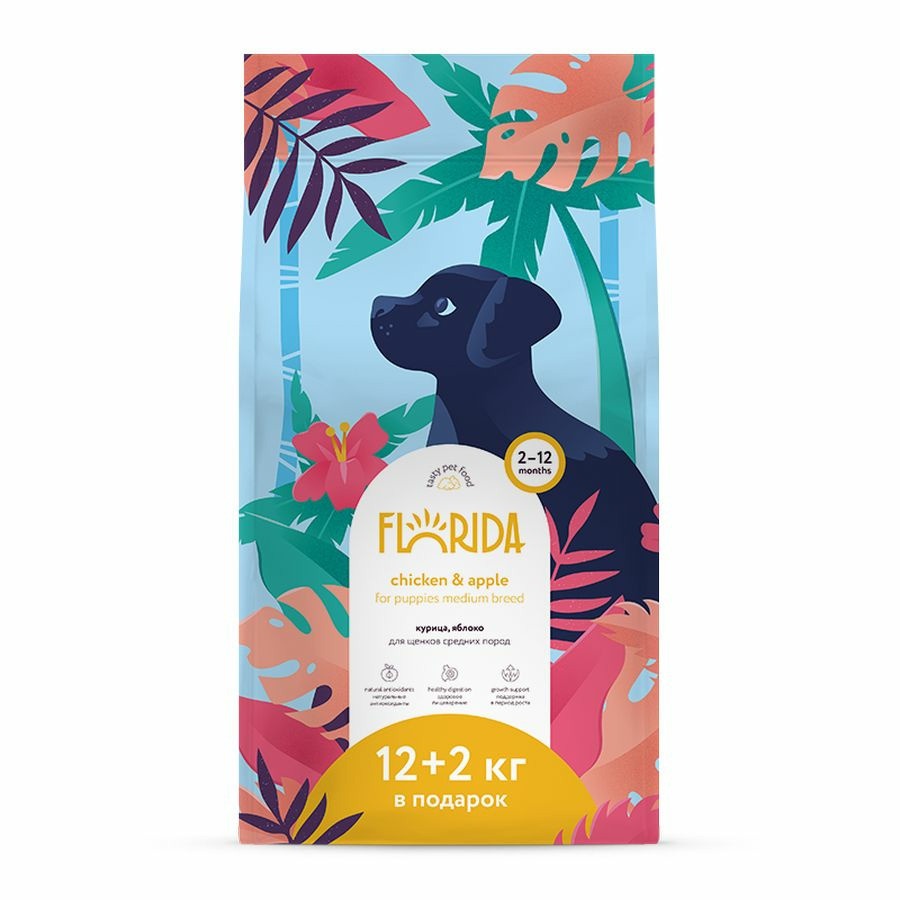Florida Chicken and Apple - сухой корм супер-премиум-класса с курицей и яблоком для щенков средних пород. Сбалансированное полнорационное питание, способствующее правильному развитию щенка. В рационе кормов Florida используется только белок животного происхождения.