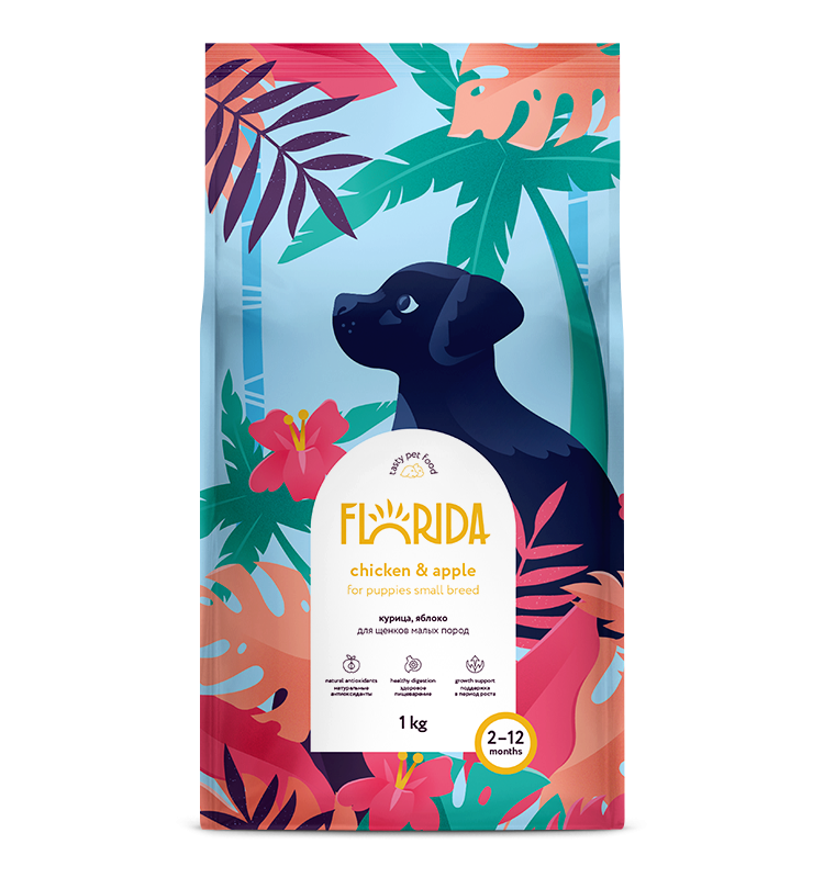 Florida Chicken and Apple - сухой корм супер-премиум-класса с курицей и яблоком для щенков малых пород с 2 до 12 месяцев. Сбалансированное полнорационное питание, способствующее гармоничному развитию щенка. В рационе кормов Florida используется только белок животного происхождения