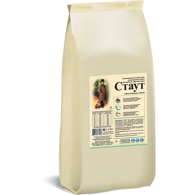 Стаут сухой корм для взрослых собак всех пород гипоаллергенный с мясом ягненка и рисом - 15 кг