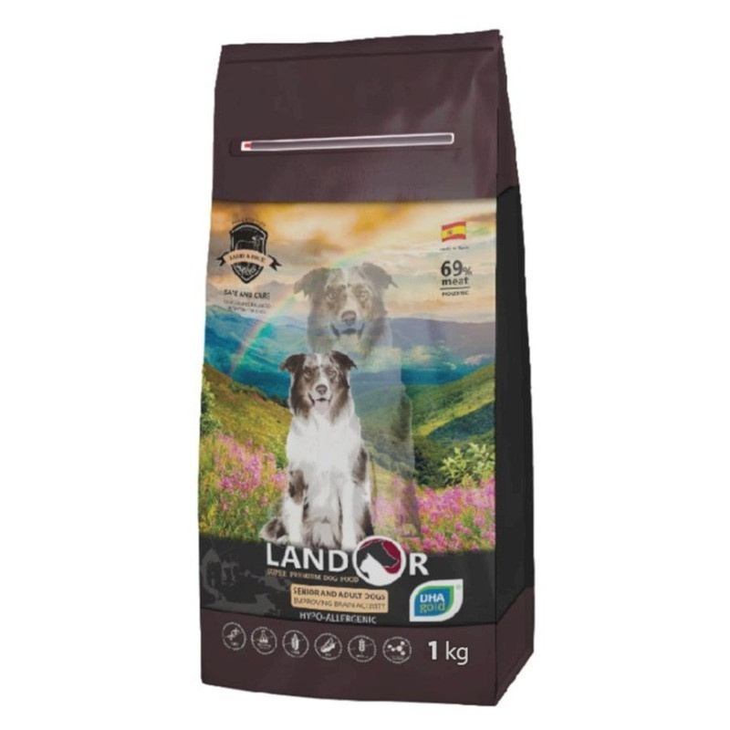 Landor сухой корм для пожилых и взрослых собак всех пород с функцией улучшения мозговой деятельности, с уткой и рисом - 1 кг