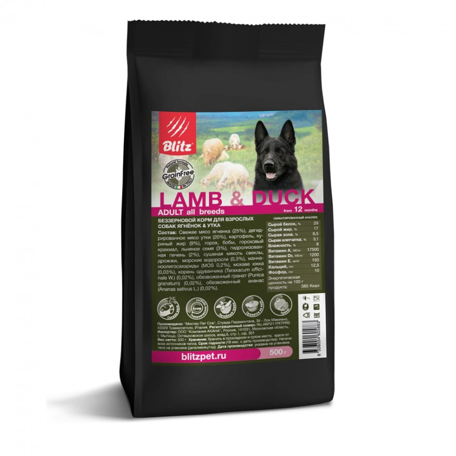 Blitz Adult сухой беззерновой корм для взрослых собак с ягненком и уткой - 500 г