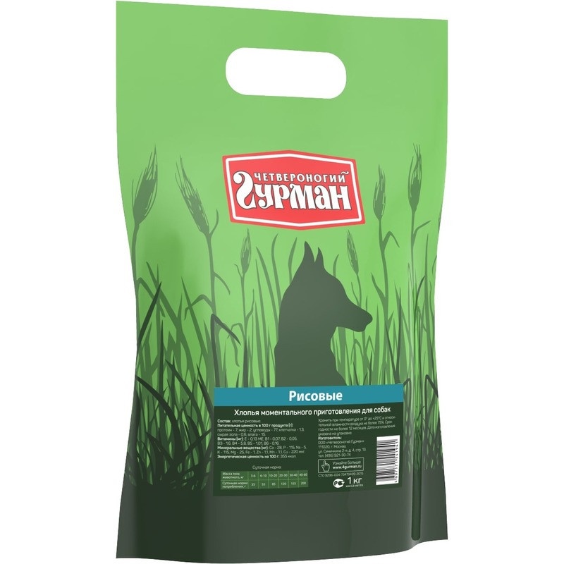 Рекомендуется использовать в сочетании с мясными консервами "Четвероногий гурман". Ингредиенты: хлопья рисовые, сушеная морковь. Пищевая ценность (в 100 г продукта): Минеральные вещества (в 100 г продукта): Витамины (в 100 г продукта): Энергетическая ценность (на 100 г): 345 ккал.