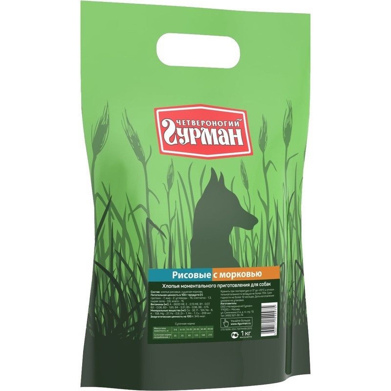 Рекомендуется использовать в сочетании с мясными консервами "Четвероногий гурман". Ингредиенты: хлопья рисовые. Пищевая ценность (в 100 г продукта): Минеральные вещества (в 100 г продукта): Витамины (в 100 г продукта): Энергетическая ценность (на 100 г): 355 ккал.