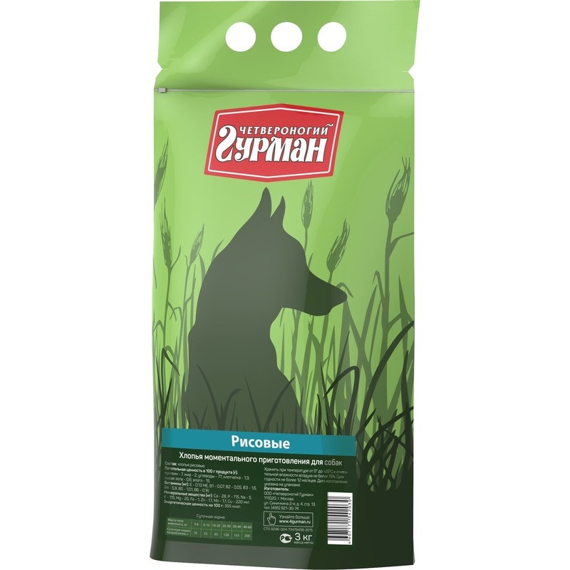 Рекомендуется использовать в сочетании с мясными консервами "Четвероногий гурман". Ингредиенты: хлопья рисовые. Пищевая ценность (в 100 г продукта): Минеральные вещества (в 100 г продукта): Витамины (в 100 г продукта): Энергетическая ценность (на 100 г): 355 ккал.