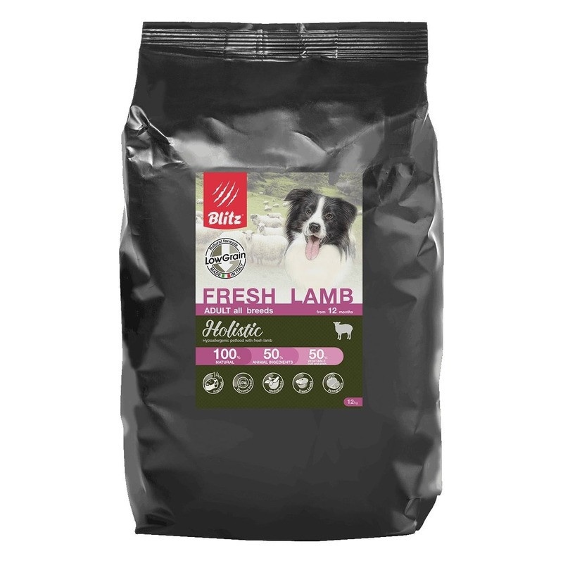 Сухой низкозерновой корм Blitz Adult для взрослых собак с ягненком - 12 кг