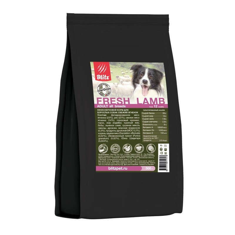 Сухой низкозерновой корм Blitz Adult для взрослых собак с ягненком - 500 г