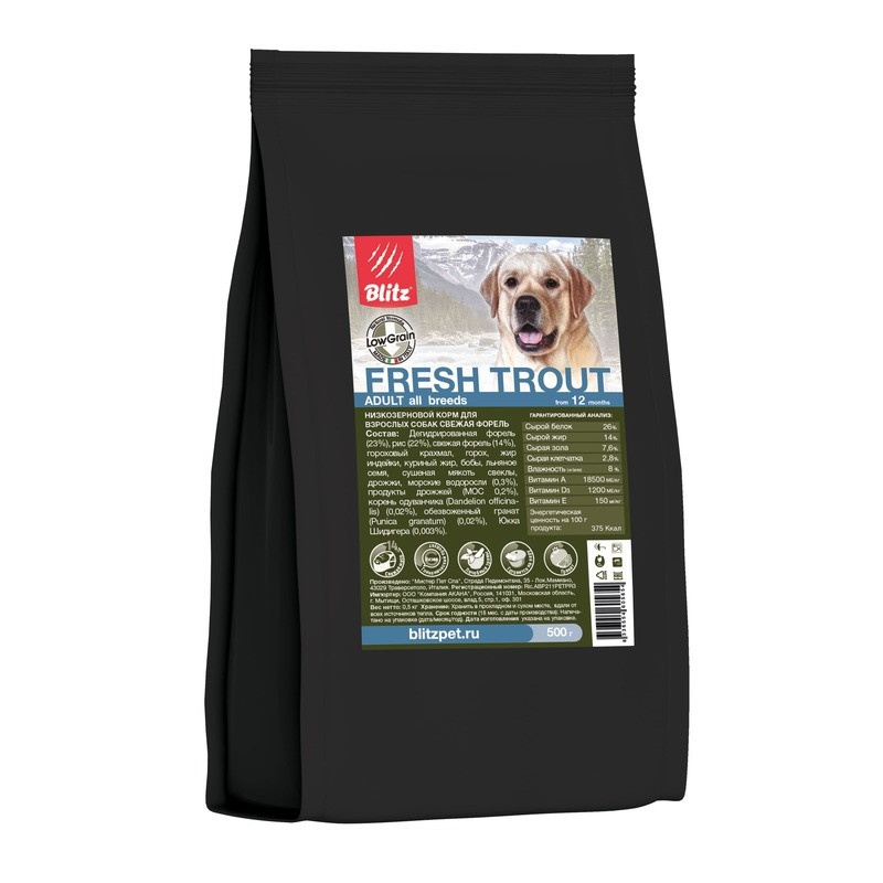 Сухой низкозерновой корм Blitz Adult для взрослых собак с форелью - 500 г