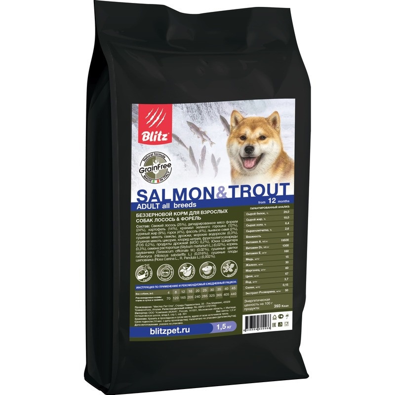 Сухой беззерновой корм Blitz Adult для взрослых собак с лососем и форелью - 1,5 кг