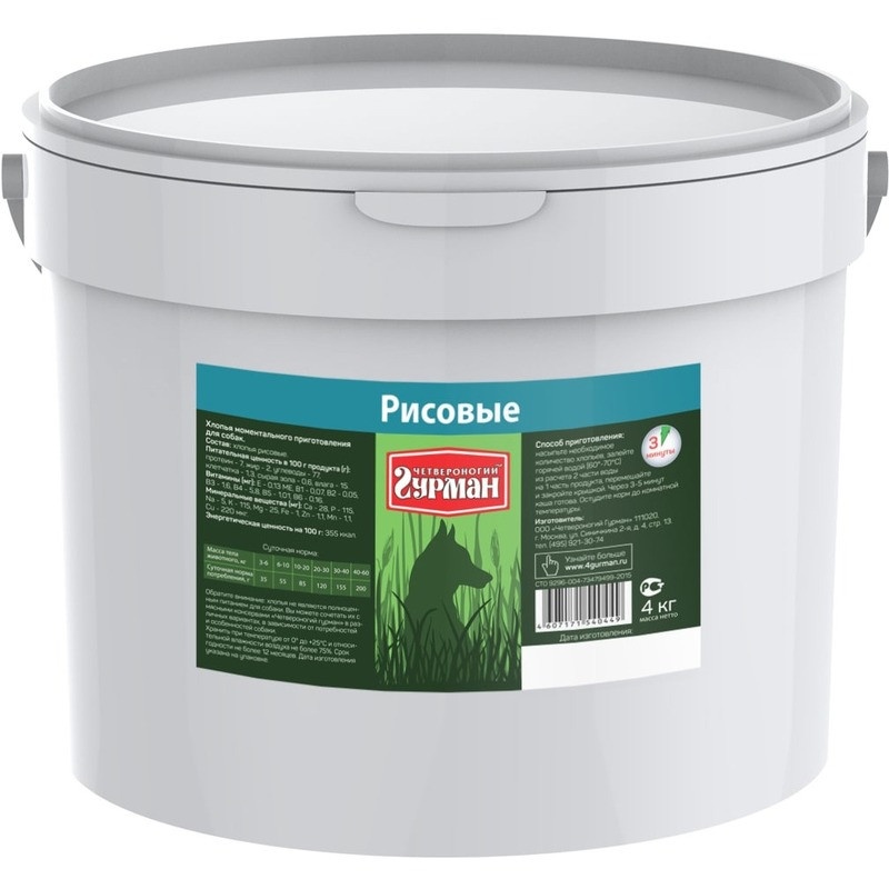 Рекомендуется использовать в сочетании с мясными консервами "Четвероногий гурман". Ингредиенты: хлопья рисовые. Пищевая ценность (в 100 г продукта): Минеральные вещества (в 100 г продукта): Витамины (в 100 г продукта): Энергетическая ценность (на 100 г): 355 ккал.