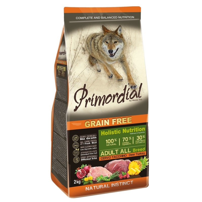 Сухой беззерновой корм Primordial для взрослых собак с олениной и индейкой 12 кг