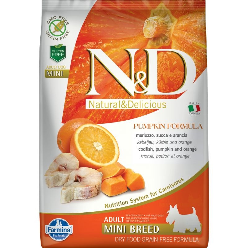 Беззерновой сухой корм Farmina N&D Dog GF Pumpkin codfish & orange adult mini с треской, апельсином и тыквой для взрослых собак мелких пород