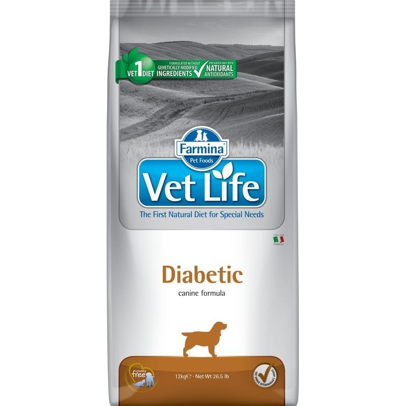 Farmina Vet life Diabetic полнорационное диетическое питание для взрослых собак для контроля потребления сахаров. Показано при диабете типа 2 и как вспомогательное средство при терапии инсулином при сахарном диабете типа 1 идля снижения массы тела.