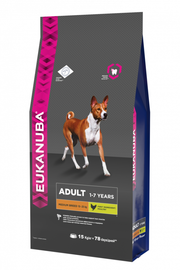 Корм сухой полнорационный Eukanuba для взрослых собак средних пород от 1 до 7 лет (10 кг -25 кг). Профессиональное сбалансированное питание, специально разработанное с учетом особенностей собак средних пород в возрасте от 1 до 7 лет.