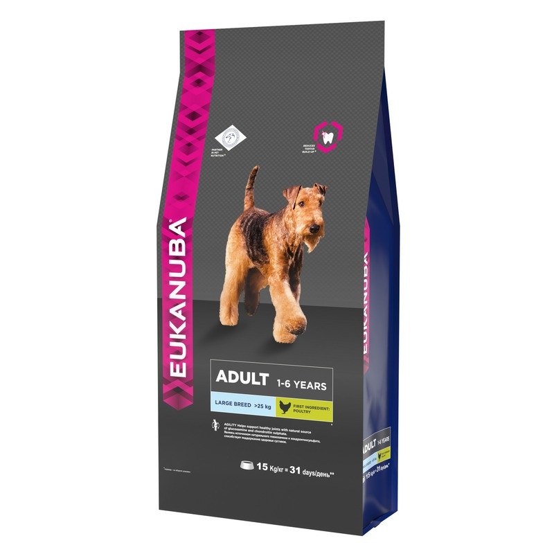 Корм сухой полнорационный Eukanuba для взрослых собак крупных и очень крупных пород от 1 до 6 лет(более 25 кг). Профессиональное сбалансированное питание, специально разработанное с учетом особенностей собак крупных и очень крупных пород в возрасте от 1 до 6 лет.