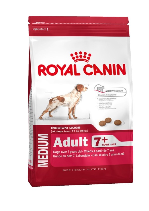Полнорационный сухой корм Royal Canin Medium Adult 7+ для стареющих собак средних размеров (вес собаки от 11 до 25 кг) в возрасте 7 лет и старше. Адаптированный состав питательных веществ помогает сохранять нормальную жизнедеятельность организма у собак средних размеров, проявляющих первые признаки старения. Содержит специальный комплекс антиоксидантов, способствующий нейтрализации свободных радикалов. Способствует оптимальному перевариванию пищи благодаря особой формуле с очень высоким содержанием белков и сбалансированным количеством пищевых волокон. Содержит питательные вещества, поддерживающие здоровое состояние кожи и шерсти. Обогащен жирными кислотами EPA-DHA. Сокращает образование зубного налета благодаря хелатам кальция.