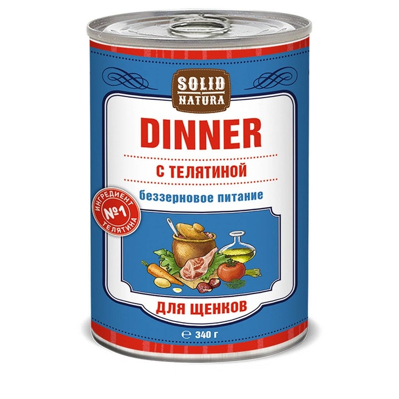 Solid Natura Dinner с телятиной - консервированное влажное питание класса премиум для щенков. Нежная консистенция в виде фарша, отличная поедаемость, в составе отсутствуют зерновые культуры. Сырой протеин – не менее 11,0 г, сырой жир – не более 8,0 г, сырая зола – не более 2,0 г, массовая доля соли – 0,3-0,5 г, таурин – 0,2 г, влага – не более 82%, общий фосфор – не более 0,7 г, кальций – не более 0,45 г.