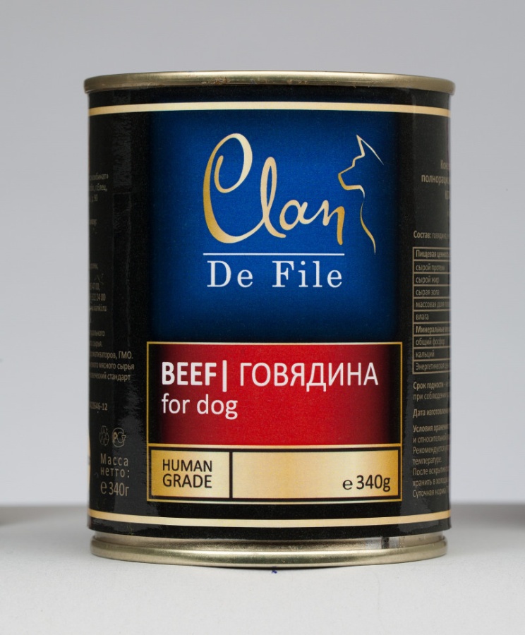 Clan De File - полнорационный влажный корм для собак. Высококачественный суперпремиальный влажный корм из мясного филе категории Human Grade (человеческий стандарт качества). Используется один вид белка в составе кормов. Срок годности - не более 3 лет со дня изготовления при соблюдении условий хранения. Дата изготовления указана на крышке банки. Состав Говядина, желирующая добавка, соль, вода. Пищевая ценность в 100 г. продукта: сырой протеин, не менее-12,0 г; сырой жир, не более- 10,0 г; сырая зола, не более 2,0 г; массовая доля поваренной соли-0,3-0,7 г; влага, не более -82%. Минеральные вещества в 100 г. продукта: общий фосфор, не более-0,4 г; кальций, не более-0,3 г; Энергетическая ценность в 100 г. продукта - 138,0 ккал.