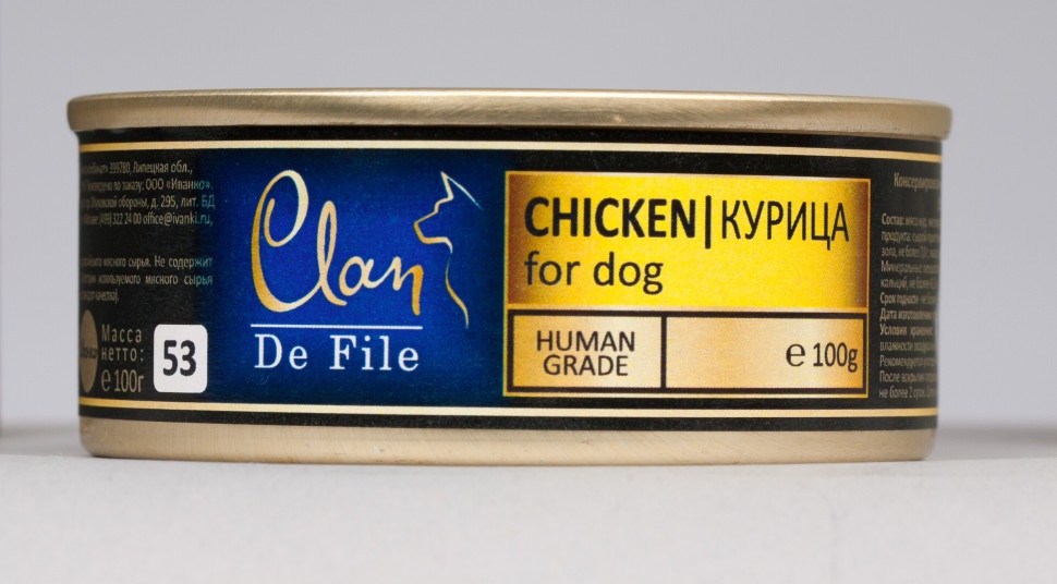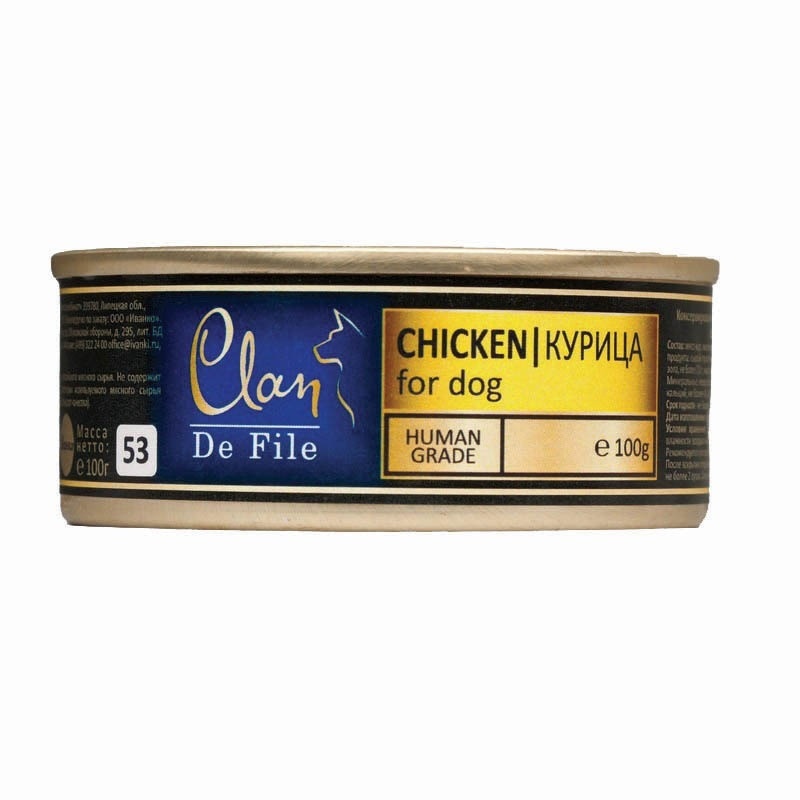 Clan De File - полнорационный влажный корм для собак. Высококачественный суперпремиальный влажный корм из мясного филе категории Human Grade (человеческий стандарт качества). Используется один вид белка в составе кормов. Срок годности - не более 3 лет со дня изготовления при соблюдении условий хранения. Дата изготовления указана на крышке банки. Состав Мясо курицы, желирующая добавка, соль, вода. Пищевая ценность в 100 г. продукта: сырой протеин, не менее - 8,0 г; сырой жир, не более - 16,0 г; сырая зола, не более - 2,0 г; массовая доля поваренной соли - 0,3-0,7 г; влага, не более - 82%. Минеральные вещества в 100 г. продукта: общий фосфор, не более - 0,4 г; кальций, не более - 0,3 г; Энергетическая ценность в 100 г. продукта - 176,0 ккал.