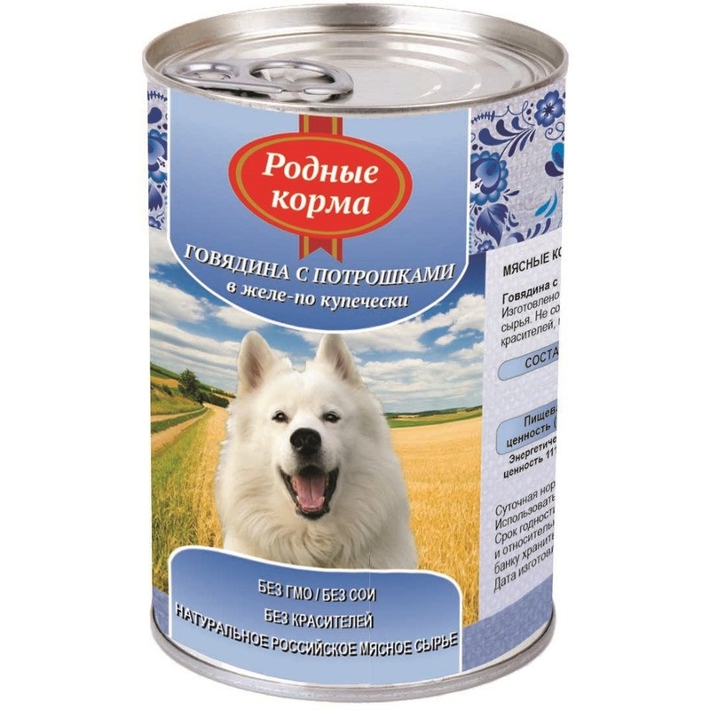 Консервы Родные Корма Говядина с потрошками в желе по купечески для собак - 970 гр х 12 шт Изготовлено из натурального российского сырья. Не содержит сои, ароматизаторов, искусственных красителей, ГМО. Срок годности: 36 мес Говядина, субпродукты, натуральная желирующая добавка, злаки (не более 2%), соль, вода Пищевая ценность на 100 гр: Протеин 8 гр., жир 7 гр., углеводы 4 гр., зола 2 гр., клетчатка 1 гр., влага до 80% Энергетическая ценность на 100 гр: 111 кКал
