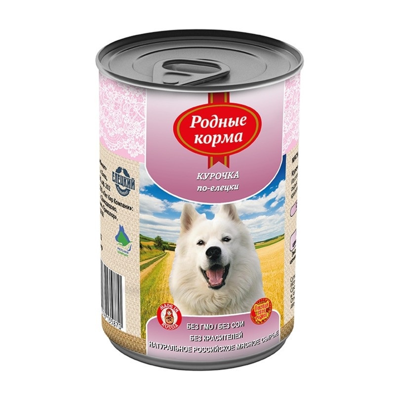Консервы Родные Корма Курочка по-елецки для собак - 970 гр х 12 шт Изготовлено из натурального российского сырья. Не содержит сои, ароматизаторов, искусственных красителей, ГМО. Срок годности: 36 мес мясо кур, субпродукты мясные, желирующая добавка, растительное масло, соль, вода Пищевая ценность на 100 гр: сырой протеин, не менее- 11,0 г; сырой жир, не более-8,0 г; сырая зола, не более- 2,0 г; массовая доля поваренной соли-0,3-0,5 г; влага, не более-82,0% Минеральные вещества в 100?г. продукта: общий фосфор, не более- 0,7 г; кальций, не более-0,5 г Энергетическая ценность на 100 гр: 103 кКал