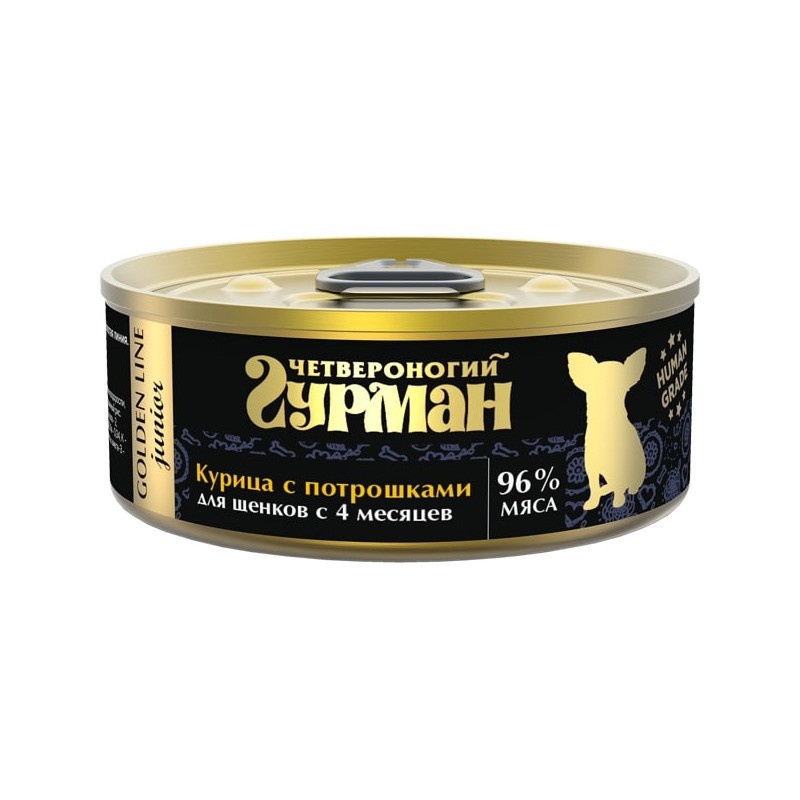 Четвероногий Гурман Golden line Baby с курицей и потрошками в желе для собак - это вкусные влажные консервы суперпремиум класса с характерным запахом настоящего мяса. В составе мясо стандарта Human grade в виде кусочков. Корм не содержит сои, консервантов, усилителей вкуса и генномодифицированных продуктов. мясо куриное, сердечки и печень куриные, жир куриный, рис, дрожжи пивные, рыбий жир, морские водоросли, юкка шедигера, желе, вода питьевая. протеин — 11,5 г, жир — 9 г, влага — 82 г, клетчатка — 0,5 г, зола — 2 г. фосфор — 0,9 г, кальций — 0,2 г, витамины (А, Д3, Е), омега-3 — 0,03 г, омега-6 — 0,005 г. Норма кормления: суточная норма 70-90 г на 1 кг веса животного. Рекомендуется употреблять при комнатной температуре.