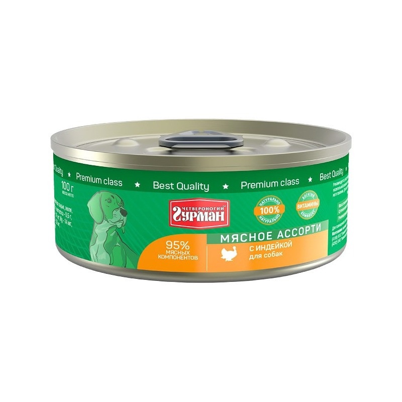 Четвероногий Гурман Мясное ассорти с индейкой для собак - мясной консервированный корм суперпремиум класса. Состоит исключительно из натуральных ингредиентов. Корм не содержит злаков, овощей и бобовых. В составе несколько видов мяса, качественные мясные субпродукты, растительное масло и каррагинан (натуральный компонент, получаемый из морских водорослей). индюшиное мясо (20%), сердце (16%), куриное мясо, легкое, рубец, печень, коллагенсодержащее сырьё, животный белок, масло растительное, соль, вода питьевая. протеин – 12 г, жир — 6,8 г, клетчатка — 0,5 г, сырая зола — 2 г, влага — 80 г, соль – 0,5 г. P — 128,6 мг, Са — 9,4 мг, Na — 160 мг, Cl — 203,4 мг, K — 240,7 мг, Mg — 13,5 мг, Fe — 3,2 мг, Cu — 212,8 мкг, Co — 1,9 мкг, Mn – 31,8 мкг, I — 3,02 мкг. А — 560 ME, Е — 0,76 ME, В1 — 0,052 мг, В2 — 0,24 мг, В3 — 1,81 мг, В5 — 0,62 мг, В6 — 0,13 мг. суточная норма 70 — 90 г на 1 кг веса животного. Рекомендуется употреблять при комнатной температуре.