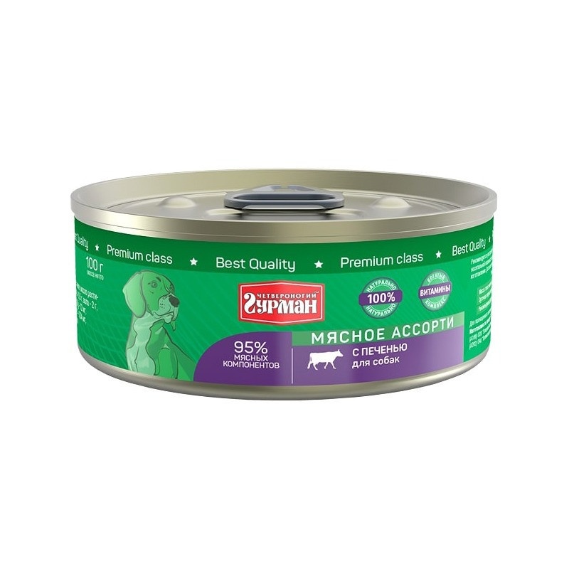 Четвероногий Гурман Мясное ассорти с печенью для собак - мясной консервированный корм суперпремиум класса. Состоит исключительно из натуральных ингредиентов. Корм не содержит злаков, овощей и бобовых. В составе несколько видов мяса, качественные мясные субпродукты, растительное масло и каррагинан (натуральный компонент, получаемый из морских водорослей).
