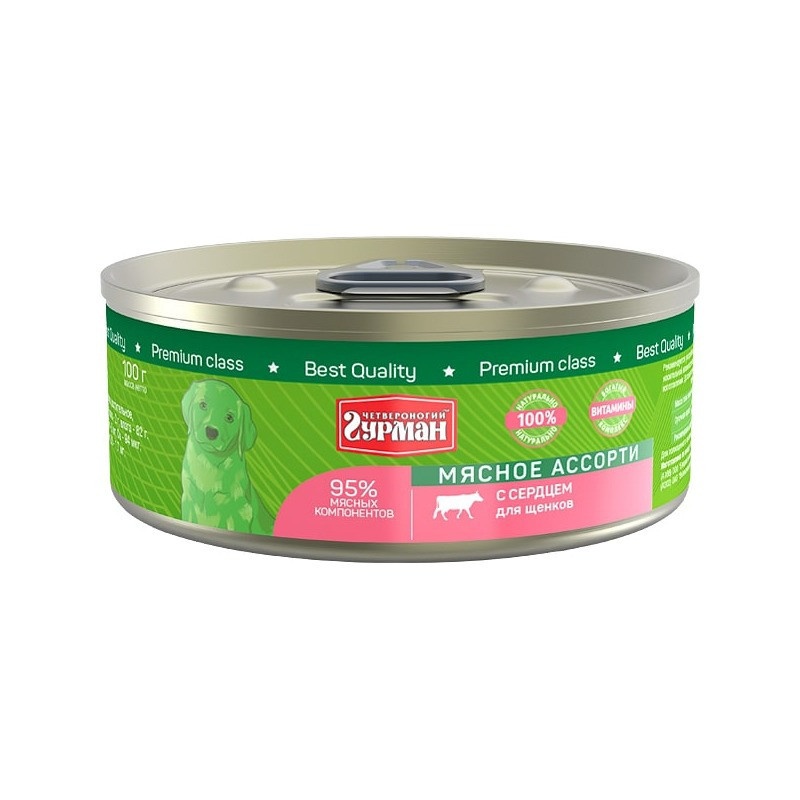 Четвероногий Гурман Мясное ассорти с сердцем для щенков - мясной консервированный корм суперпремиум класса. Состоит исключительно из натуральных ингредиентов. Корм не содержит злаков, овощей и бобовых. В составе несколько видов мяса, качественные мясные субпродукты, растительное масло и каррагинан (натуральный компонент, получаемый из морских водорослей).