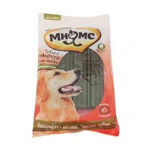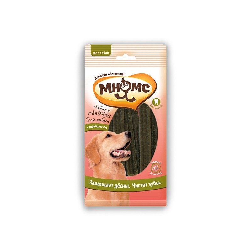 Вкусные и полезные палочки Мнямс помогут защитить зубы и дёсны Вашего питомца. Благодаря форме палочки, собака при жевании её будет одновременно массировать дёсны и очищать зубы от налёта. Содержащийся в палочках эвкалипт на долго освежит дыхание из пасти.