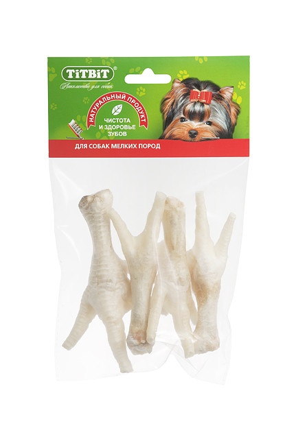 Titbit лапки куриные - мягкая упаковка. Обеспечивает дополнительное поступление в организм необходимых элементов для роста, развития и поддержания в норме суставов. Привлекательное лакомство для собак мелких пород, используется как игрушка, отлично очищает зубы и массирует десны. Применять с осторожностью для собак с аллергией на куриный белок. Изделие содержит трубчатую кость и не предназначено для полного поедания. Как только собака съела футляр из кожи, сухожилий и мышц – необходимо заменить лакомство на новое.