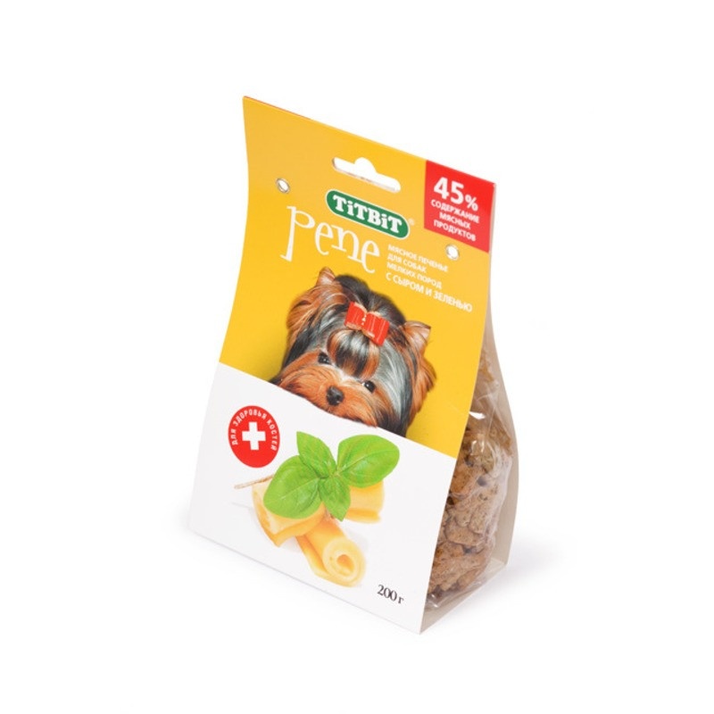 Titbit печенье PENE с сыром и зеленью. Молочный жир содержит лецитин, играющий важную роль в правильном обмене жиров в организме собак. Сыр является источником витамина А и витаминов группы В. Благодаря своим питательным и вкусовым свойствам сыр способен возбуждать аппетит. Шпинат содержит полноценные белки, легко усваиваемые организмом собак, почти все известные нам витамины, а также он богат солями железа, фосфора, кальция и калия.