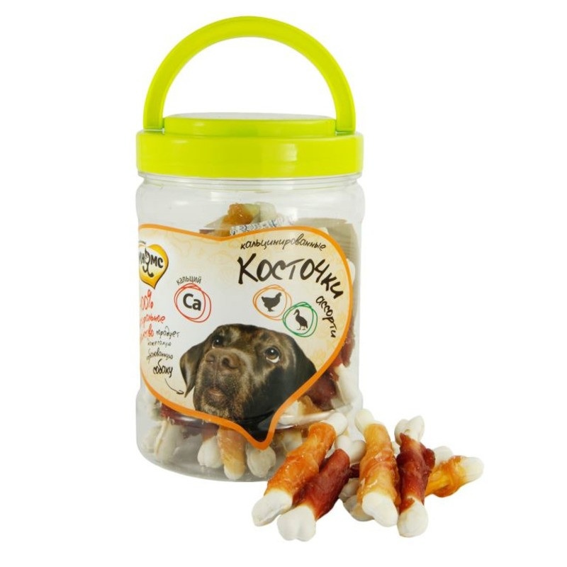 Мнямс лакомство для собак ассорти кальцинированные косточки с куриным и утиным мясом.