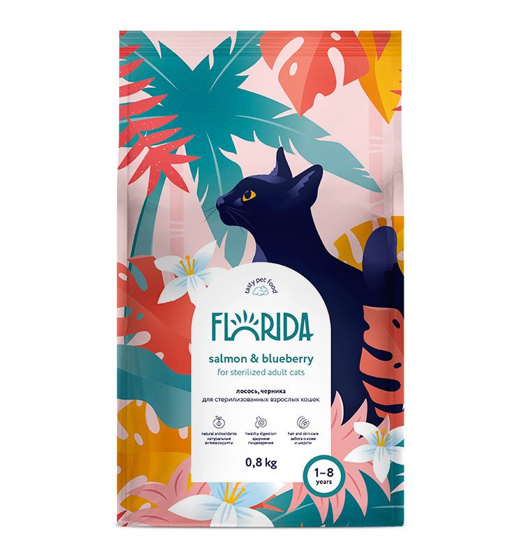 Florida Salmon & Blueberry - сухой корм супер-премиум-класса с лососем и черникой для стерилизованных кошек в возрасте от 1 до 8 лет. Сбалансированное полнорационное питание заботится о коже и шерсти и способствует здоровому пищеварению. В рационе кормов Florida используется только белок животного происхождения.