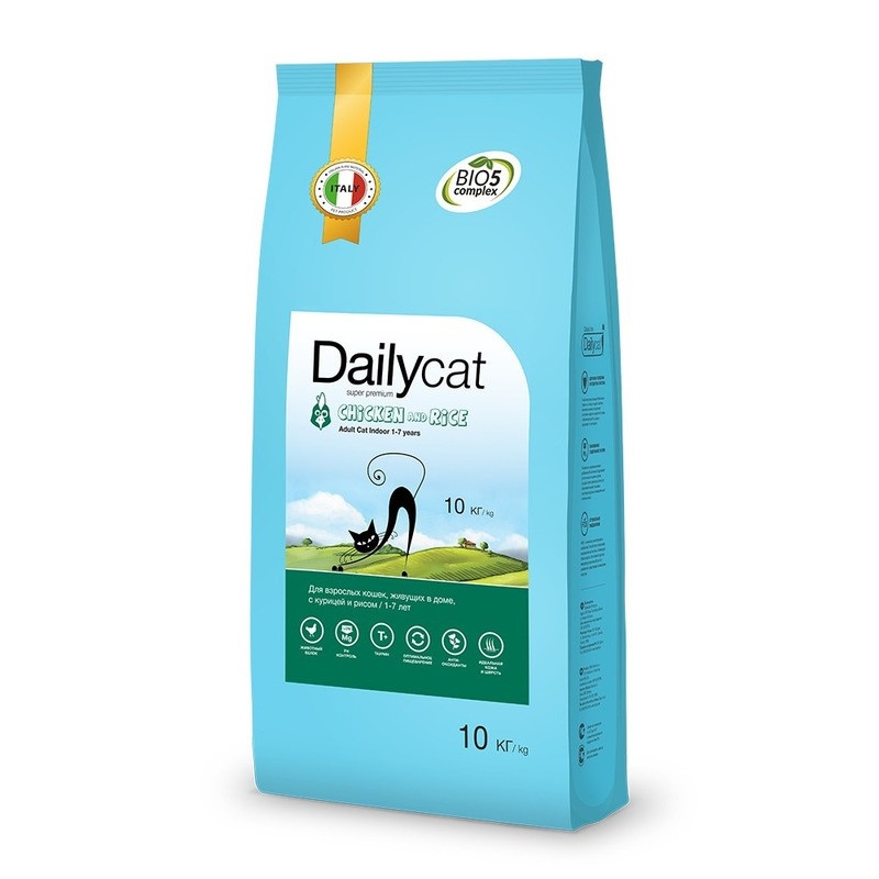 Dailycat – это линия кормов следующего поколения, в которых сочетаются не только опыт и традиционный подход к питанию кошек и новейшие разработки, направленные на прекрасное здоровье и долгую, полноценную жизнь хвостатых любимцев. Линия кормов Dailycat изготавливается из самых лучших и свежих ингредиентов на современном заводе Effeffe в самом сердце сельской местности Ломбардии (Италия), в соответствии со всеми европейскими стандартами. Питание кота – дело деликатное, к которому следует иметь особый подход, поэтому подбор пищи может стать настоящей проблемой. При создания корма супер-премиум класса для кошек не выходящих на улицу Dailycat Indoor Chicken and Rice были проведены новейшие исследования в области диетологии. В состав корма вошли компоненты помогающие кошкам живущим в помещении, сохранить здоровье и хорошую форму благодаря контролю за содержанием калорий и технологии выведения комков шерсти из ЖКТ. Dailycat Indoor Chicken and Rice – корм супер премиум класса для взрослых кошек. Рекомендован для кошек и котов от 1 года и до 7 лет жизни. Дегидратированное мясо (курица 24%), кукуруза, рис (10%),кукурузный глютен, животный жир, пшеница, сушеный жом свеклы, растительные волокна, сушеный жом цикория,фруктоолигосахариды (ФОС), рыбий жир, натрия хлорид, калия хлорид, дикальций фосфат, юкка Шидигера. СОДЕРЖАНИЕ ПИТАТЕЛЬНЫХ ВЕЩЕСТВ: Пищевые добавки: