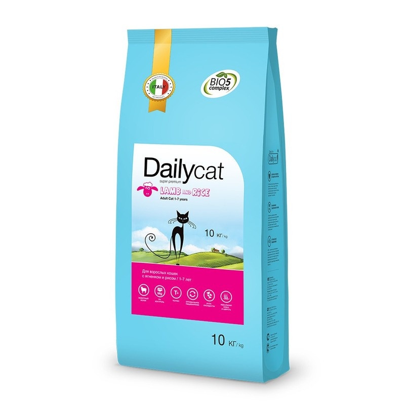 Dailycat – это линия кормов следующего поколения, в которых сочетаются не только опыт и традиционный подход к питанию кошек и новейшие разработки, направленные на прекрасное здоровье и долгую, полноценную жизнь хвостатых любимцев. Линия кормов Dailycat изготавливается из самых лучших и свежих ингредиентов на современном заводе Effeffe в самом сердце сельской местности Ломбардии (Италия), в соответствии со всеми европейскими стандартами. Питание кота – дело деликатное, к которому следует иметь особый подход, поэтому подбор пищи может стать настоящей проблемой. Рацион необходимо подбирать, опираясь не только на вкусовые предпочтения животного, но и на его самочувствие. Разнообразное меню Dailycat удовлетворит любые вкусовые пристрастия и прихоти усатого питомца, существенно облегчая Вам заботу о нем. Dailycat Adult Lamb and Rice – корм супер премиум класса для взрослых кошек. Рекомендован для кошек и котов от 1 года и до 7 лет жизни. Dailycat – это гарантия отличного самочувствия и превосходного настроения для каждого хвостатого питомца. Дегидратированное мясо (ягненок 20%), рис 15%, пшеница, ячмень, животный жир, картофельный белок, кукурузный глютен, сушеный жом свеклы, сухие дрожжи, льняное семя, горох шрот, подсолнечное масло, фруктоолигосахариды (ФОС) 1%, сушеный жом цикория 1%, рыбий жир 0,5%, натрия фосфат, калия хлорид, биологический комплекс растительных экстрактов 0.03% (розмарин, календула, фенхель, кукурма), юкка Шидигера. СОДЕРЖАНИЕ ПИТАТЕЛЬНЫХ ВЕЩЕСТВ: Пищевые добавки: Витамин А 31,000 ед/кг, Витамин D3 1,600 МЕ/кг, витамин Е (все-Рац-Альфа-токоферола ацетат) 370 мг/кг, витамин К (МНБ) 1 мг, Витамин B1 (тиамина мононитрат) 6,5 мг/кг, витамин В2 (рибофлавин) 20 мг/кг, витамин В6 10 мг/кг, витамин В12 0,09 мг/кг, ниацин 45 мг/кг, фолиевая кислота 1 мг/кг, кальций D-пантотенат 27 мг/кг, биотин 0,28 мг/кг, витамин C (аскорбил монофосфат кальция, соли натрия) 200 мг/кг, бета-каротин 27 мг/кг, холина хлорид 2,500 мг/кг, таурин 2500 мг/кг, DL- метионин 1000 мг/кг, L-карнитин 100 мг/кг, моногидрат железистого сульфата 715 мг/кг (железа 215 мг/кг), меди сульфат пентагидрат 44 мг/кг (медь 11 мг/кг), сульфат цинка моногидрат 485 мг/кг (цинк 215 мг/кг), марганца сульфат моногидрат 129 мг/кг (марганец 40 мг/кг), йодат кальция безводный 2,5 мг/кг (йод 1,6 мг/кг), селенит натрия 0,93 мг/кг (селен 0,42 мг/кг).