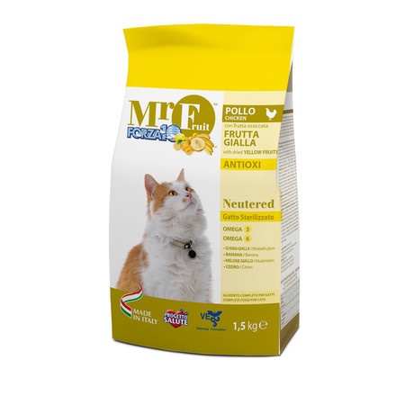 Корм для стерилизованных кошек. С низкой концентрацией жиров, а также пониженным содержанием минералов, способных стать причиной возникновения мочекаменной болезни. Mr. Fruit Neutered - это корм, специально разработанный для стерилизованных кошек: низкая концентрация жиров, а также пониженное содержание минералов, способных стать причиной возникновения мочекаменной болезни. Специфические свойства жёлтых фруктов усиливают действие ингредиентов. Маис, обработанные белки курицы (22%), рис, куриный жир, обработанные белки свинины, пивные дрожжи, пульпа свеклы (2%), рыбная мука, минеральные вещества, клетчатка, мука высушенных плодов рожкового дерева, желтая дыня (0.0028%), цитрон (0.0021%), дегидратированные дрожжи (Био МОС), ФОС, Юкка Шидигера.