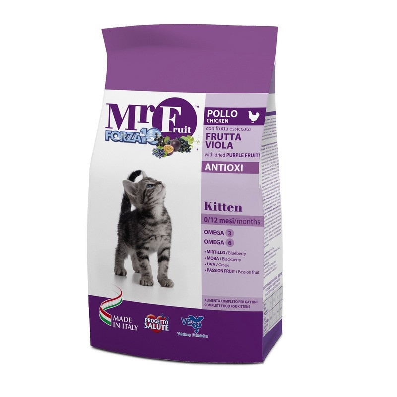 Корм для котят до 12 мес. С экстрактами антиоксидантов. Для укрепления имунной системы организма котенка. Натуральные растительные добавки. Для гармоничного развития Вашему котёнку ежедневно необходимо достаточное количество питательных веществ, а также витаминов, минералов и основных незаменимых жирных кислот. Формула корма MR. Fruit Kitten была разработана ветеринарными врачами компании SANYpet для обеспечния всем тем, что необходимо организму на стадии развитии роста. Корм обогащён молозивом, которое укрепляет иммунную систему организма. Специфические свойства ""Фиолетовых"" фруктов усиливают его действие.