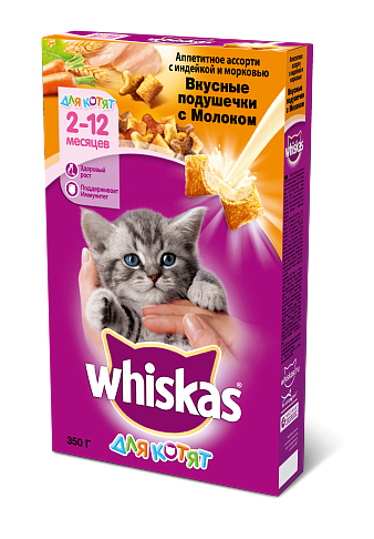 Whiskas сухой корм в форме вкусных подушечек с молоком, индейкой и морковью для котят от 2 до 12 месяцев - 350 гр