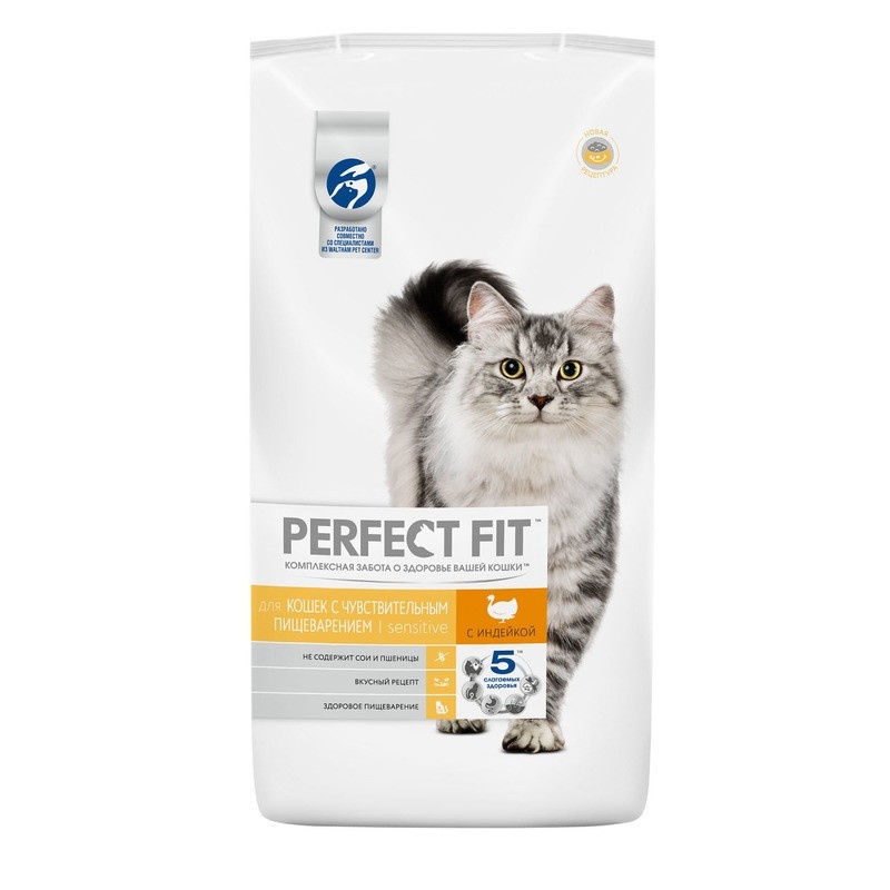 Perfect Fit Sensitive – рацион, адаптированный специально для кошек с особенностями пищеварения. Он содержит пребиотики, способствующие поддержанию здоровой микрофлоры кишечника, и не содержит пшеницы и сои, которые могут вызвать дискомфорт в желудке кошки.
