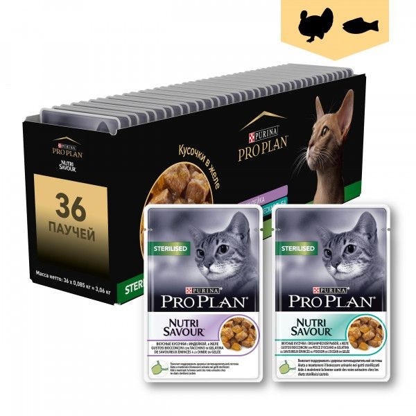 Pro Plan "Sterilised" для стерилизованных кошек MIX Индейка, Рыба ПАУЧ ЖЕЛЕ 85 г x 36 шт