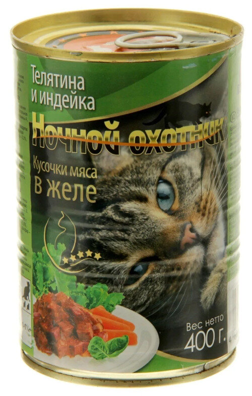 НОЧНОЙ ОХОТНИК КОНСЕРВЫ ДЛЯ КОШЕК С ТЕЛЯТИНОЙ И ИНДЕЙКОЙ В ЖЕЛЕ 400 гр.