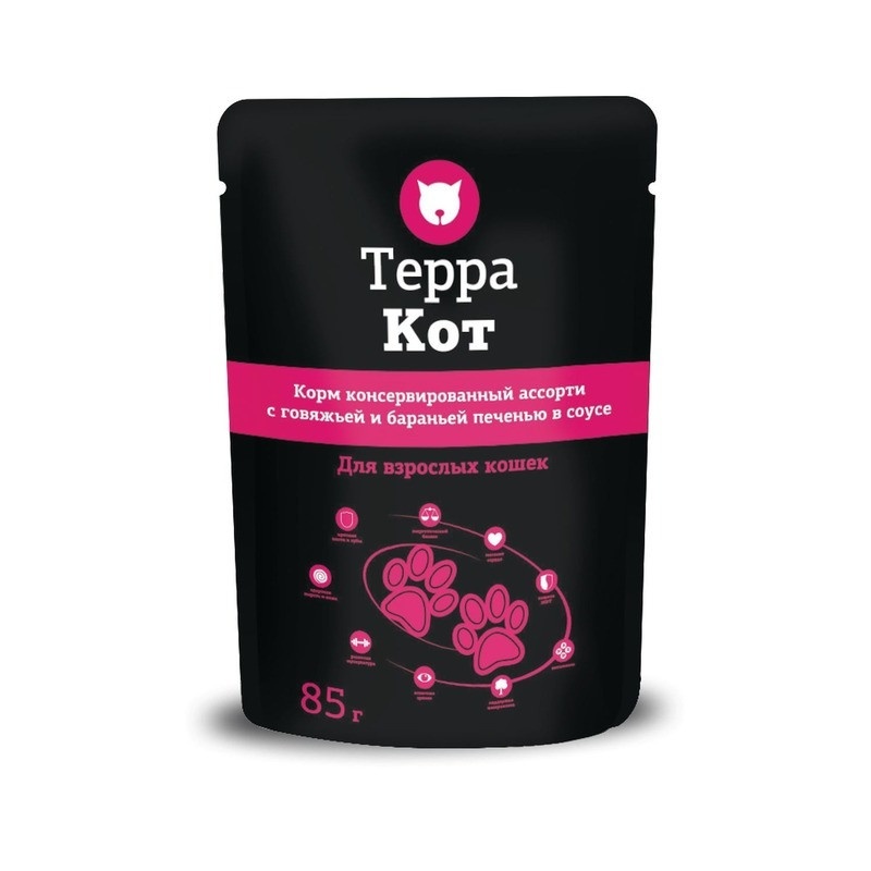 Терра Кот влажный корм для взрослых кошек всех пород ассорти с говяжьей и бараньей печенью в соусе - 85 г