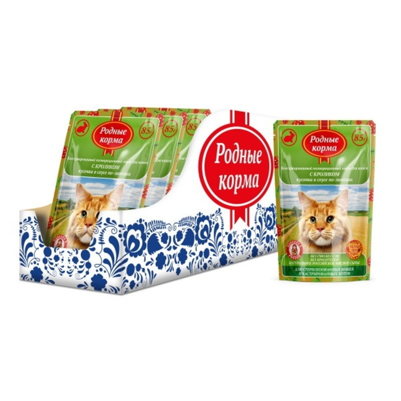 Родные корма полнорационный корм для кошек с кроликом кусочки в соусе по-липецки 1х32 пауч 85 г