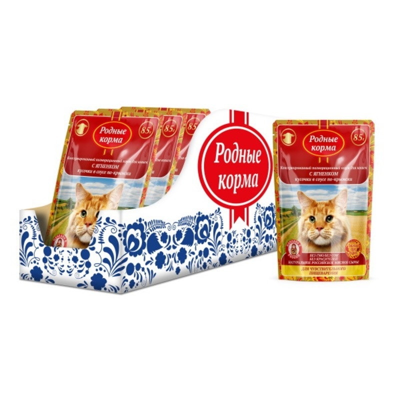 Родные корма полнорационный корм для кошек с ягненком кусочки в соусе по-крымски 1х32 пауч 85 г