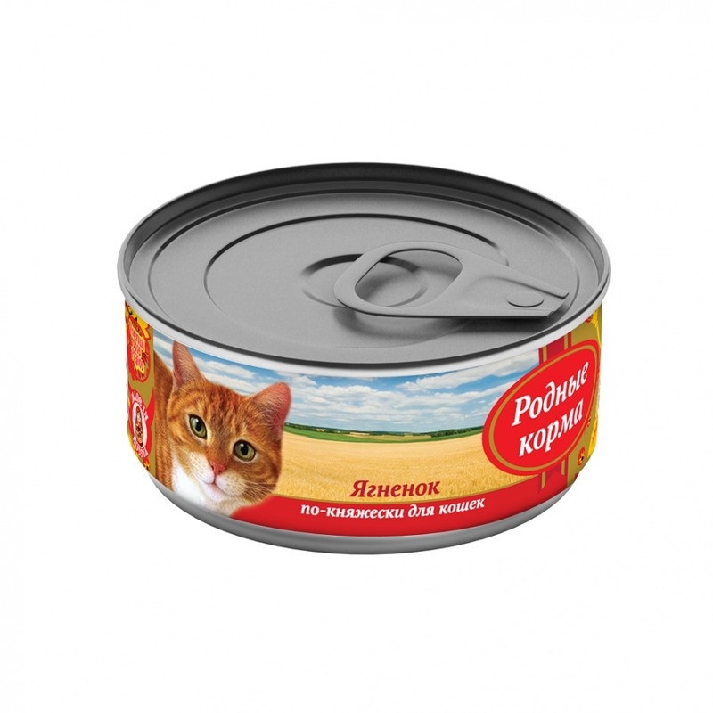 Влажный корм для кошек в консервах Родные Корма Ягненок по-княжески в банке 100 гр х 24 шт ягненок, субпродукты мясные, морковь, желирующая добавка, рыбная мука, рыбий жир, сухие дрожжи, таурин, растительное масло, калия хлорид, сухой яичный желток, калия цитрат, злаки, йодированная соль, вода Пищевая ценность: Сырой протеин, не менее-10,0 г; сырой жир, не более- 7,0 г; сырая зола, не более- 2,0 г; массовая доля поваренной соли-0,3-0,5 г;таурин-0,2 г; влага, не более-82,0% Минеральные вещества в 100?г. продукта: общий фосфор, не более- 0,7 г; кальций, не более-0,5 г Энергетическая ценность: 103 кКал