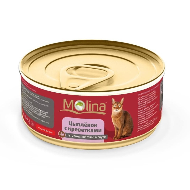 Натуральные консервы в соусе с высоким содержанием мяса цыпленка и креветками. Все виды консервов Molina состоят исключительно из отборных натуральных компонентов и не содержат ГМО, сою, искусственные красители, консерванты и усилители вкуса. В процессе производства консервов используется исключительно отборное охлажденное сырье, никакой заморозки! Ингредиенты: Содержание питательных веществ:
