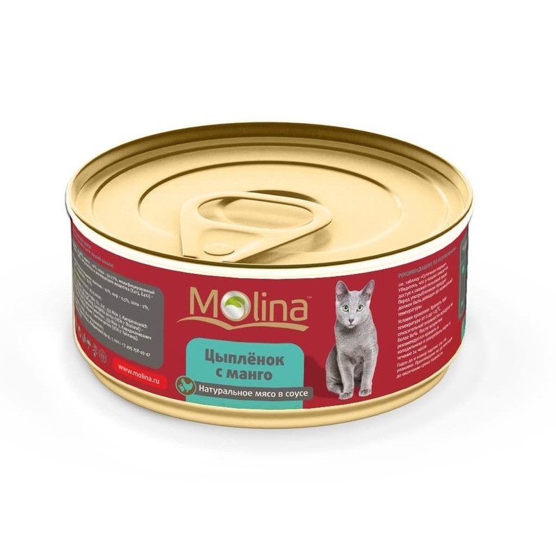 Натуральные консервы в соусе с высоким содержанием мяса цыпленка и манго. Все виды консервов Molina состоят исключительно из отборных натуральных компонентов и не содержат ГМО, сою, искусственные красители, консерванты и усилители вкуса. В процессе производства консервов используется исключительно отборное охлажденное сырье, никакой заморозки!