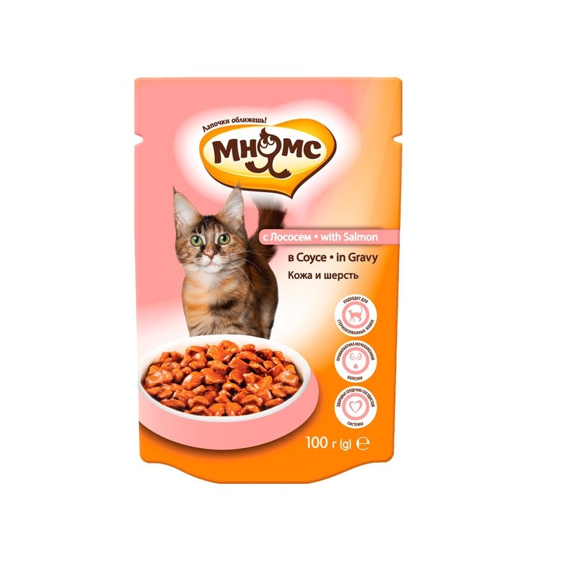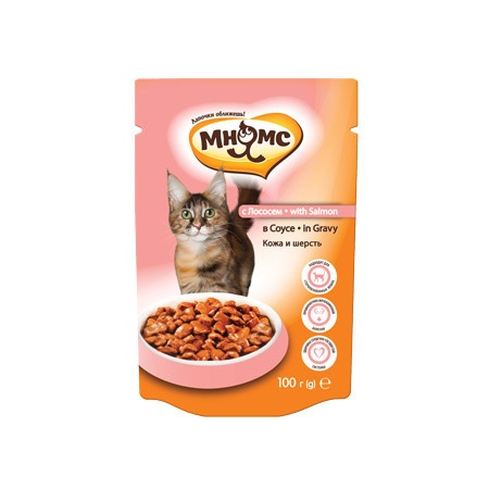 Мнямс паучи Кожа и шерсть с лососем в соусе для взрослых кошек - 100 г