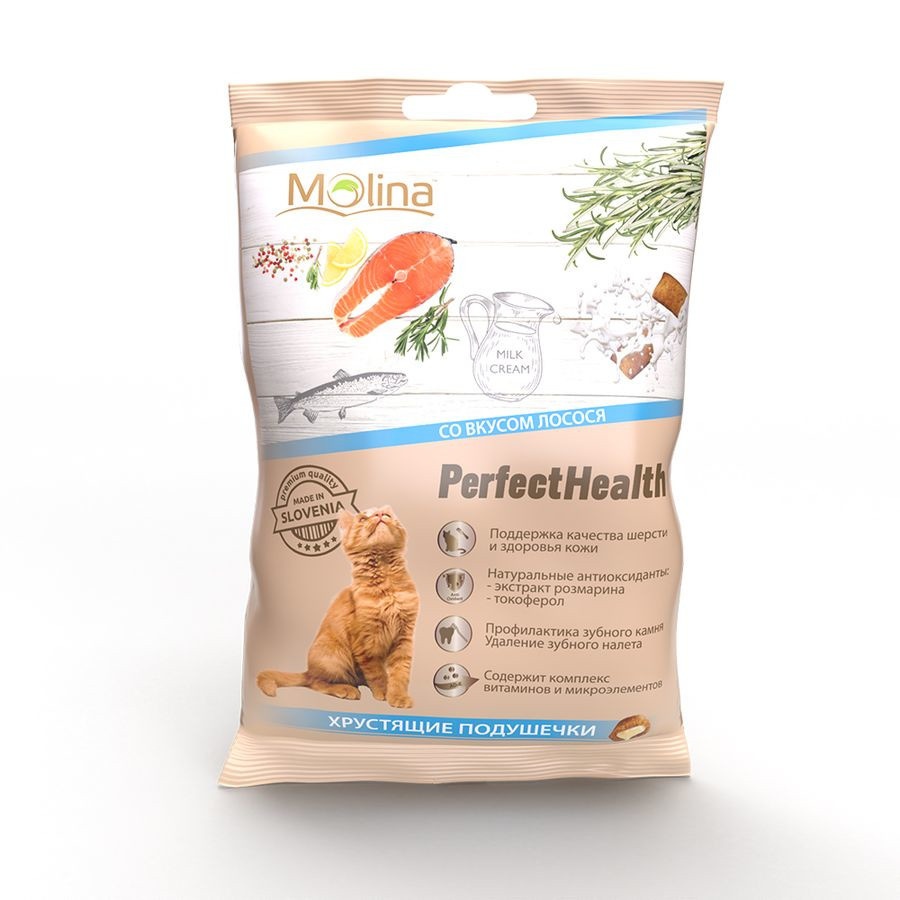 Molina Perfecthealth хрустящие подушечки для кошек - это натуральное и полезное лакомство со вкусом лосося и сливочной начинкой.